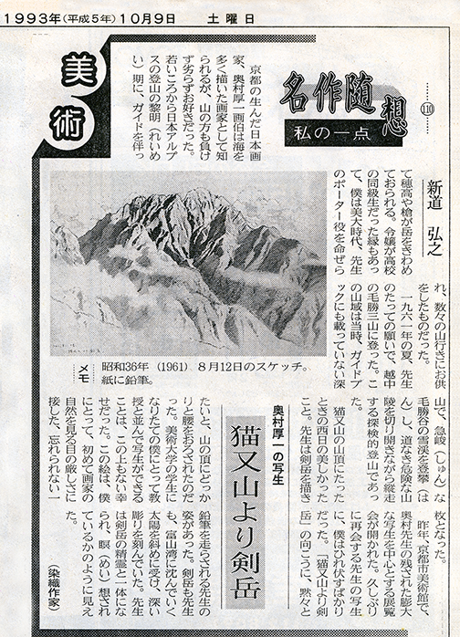 1992年(平成4年)京都市美術館「奥村厚一のスケッチ展」新聞記事